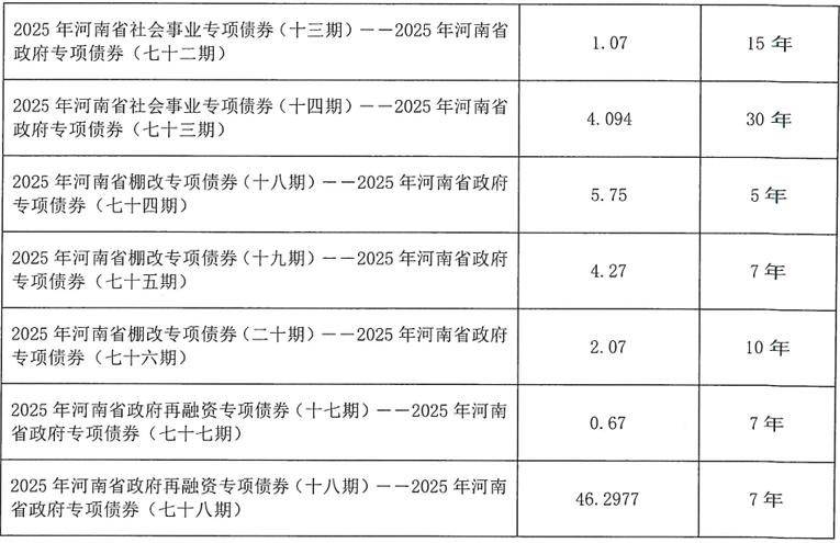 2025年河南省政府專項(xiàng)債券(七十至七十六期)擬發(fā)行金額79.052億元,主要用于74個(gè)城鄉(xiāng)發(fā)展、社會(huì)事業(yè)、棚戶區(qū)改造項(xiàng)目。